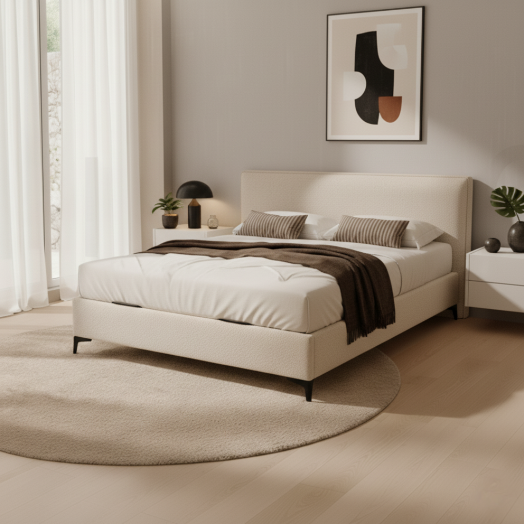 El Saona destaca por su diseño elevado, tiradores metálicos exclusivos y tapizado premium, combinando estética sofisticada y funcionalidad en un mismo canapé.